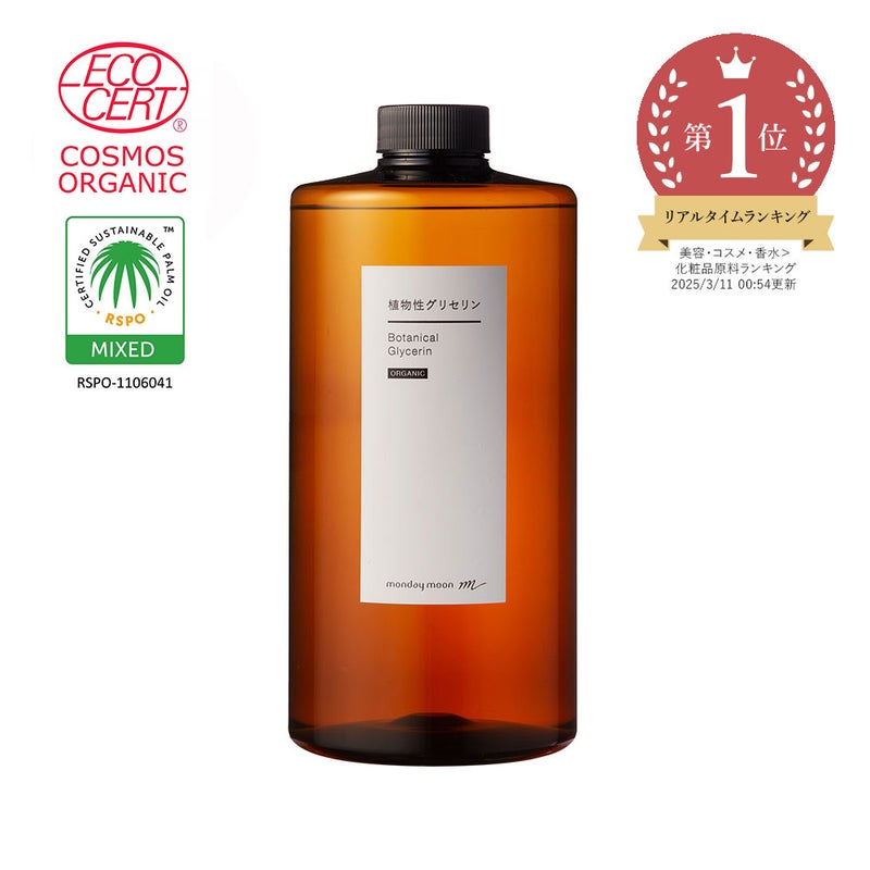 一般的なグリセリンは精製水などで希釈されていますが、マンデイムーンでは希釈前の濃グリセリンを販売しています。濃グリセリンとは濃度が95%以上のグリセリンのことで、少量でしっかりと保湿効果をプラスできます。とろみがあり、しっとりとした上質な使い心地が特徴です。