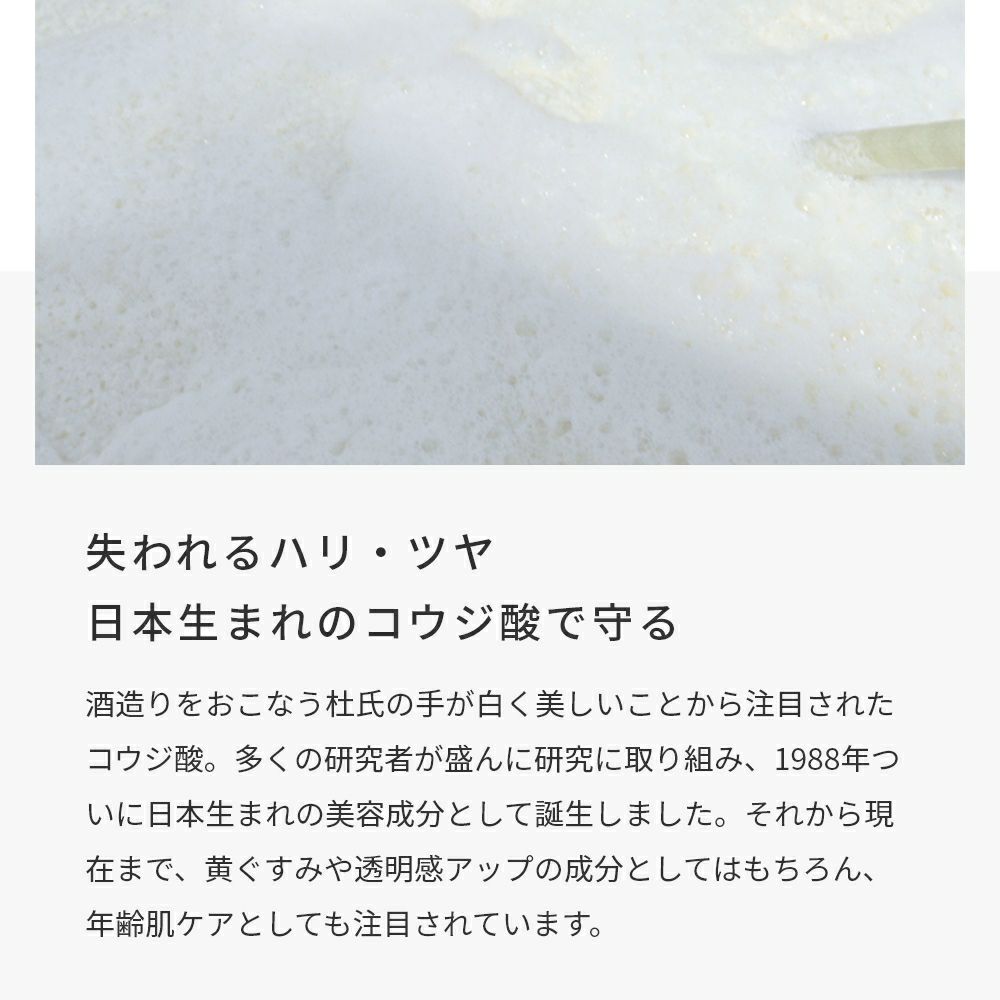 酒造りをおこなう杜氏の手が白く美しいことから注目されたコウジ酸。多くの研究者が盛んに研究に取り組み、1988年ついに日本生まれの美容成分として誕生しました。それから現在まで、黄ぐすみや透明感アップの成分としてはもちろん、年齢肌ケアとしても注目されています。
