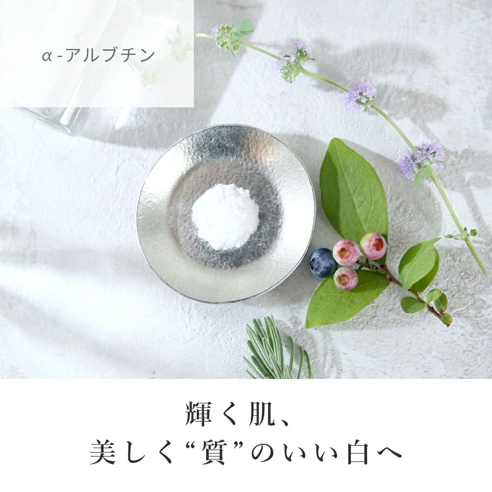アルブチンの2種類のうち、α-アルブチンはハイドロキノンを安定化させた成分です。ハイドロキノンは刺激を感じる方も多いのですが、アルブチンは肌への刺激も少ないため、敏感肌の方でも安心してお使いいただけます。また、β-アルブチンよりも強力に効果を発揮することから、その高い効果と安全性を両立し、黒点予防に積極的にはたらきかけます。