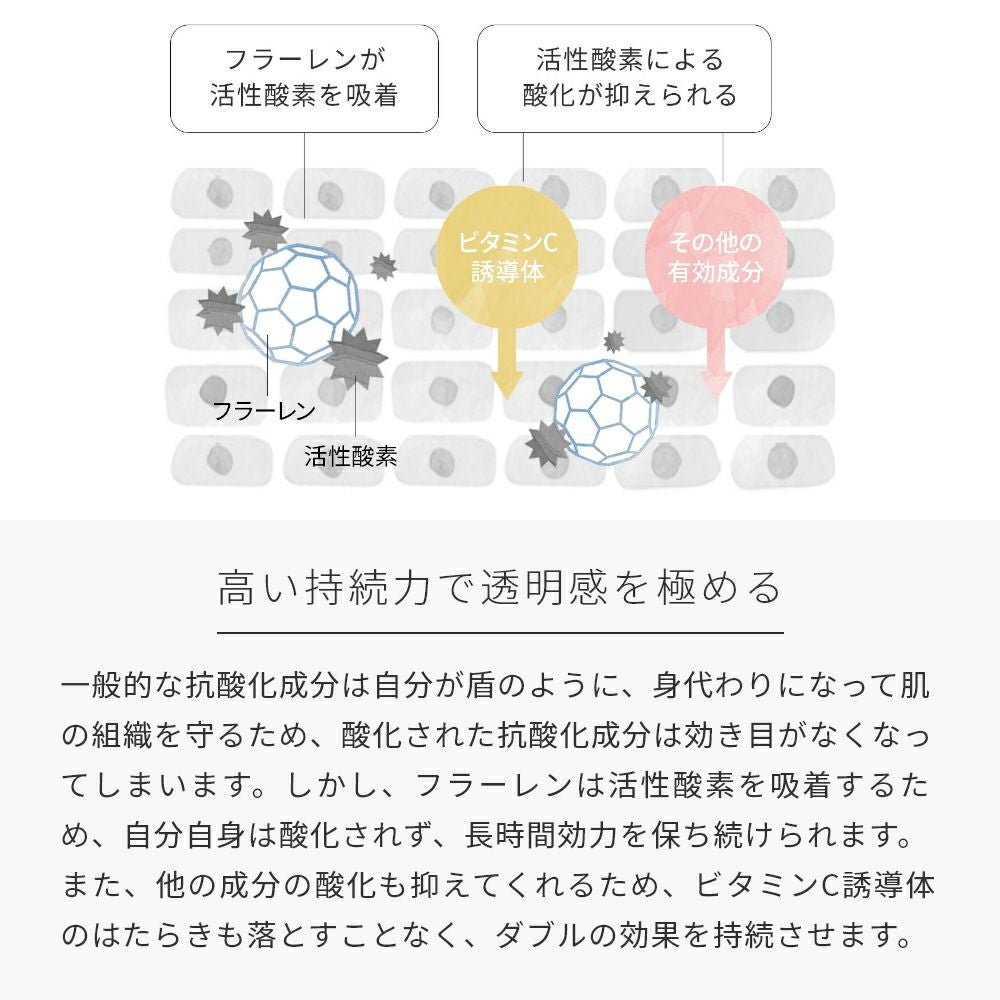 一般的な抗酸化成分は自分が盾のように、身代わりになって肌の組織を守るため、酸化された抗酸化成分は効き目がなくなってしまいます。しかし、フラーレンは活性酸素を吸着するため、自分自身は酸化されず、長時間効力を保ち続けられます。また、他の成分の酸化も抑えてくれるため、ビタミンC誘導体のはたらきも落とすことなく、ダブルの効果を持続させます。