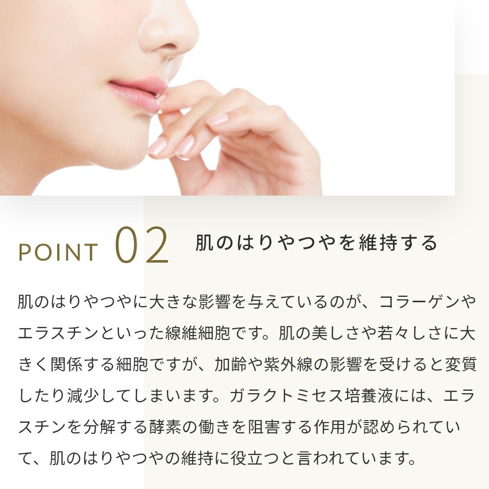 ガラクトミセス培養液には、エラスチンを分解する酵素の働きを阻害する作用が認められていて、肌のはりやつやの維持に役立つと言われています。