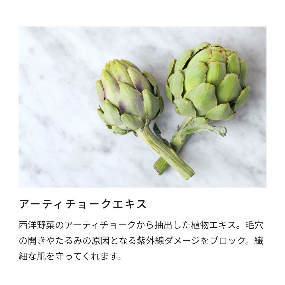 西洋野菜のアーティチョークから抽出した植物エキス。毛穴の開きやたるみの原因となる紫外線ダメージをブロック。繊細な肌を守ってくれます。