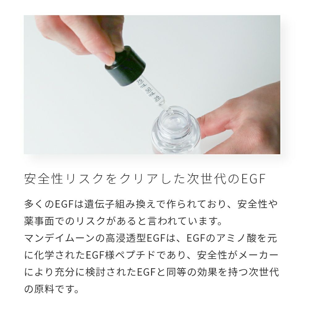 多くのEGFは遺伝子組み換えで作られており、安全性や薬事面でのリスクがあると言われています。マンデイムーンの高浸透型EGFは、EGFのアミノ酸を元に化学されたEGF様ペプチドであり、安全性がメーカーにより充分に検討されたEGFと同等の効果を持つ次世代の原料です。
