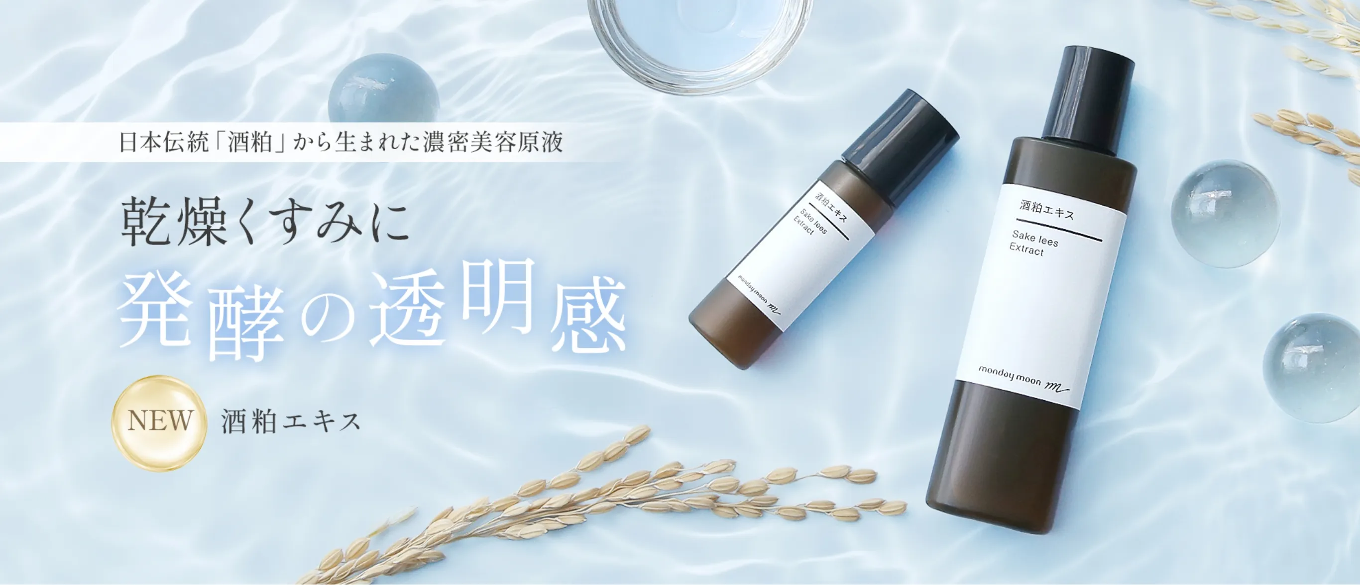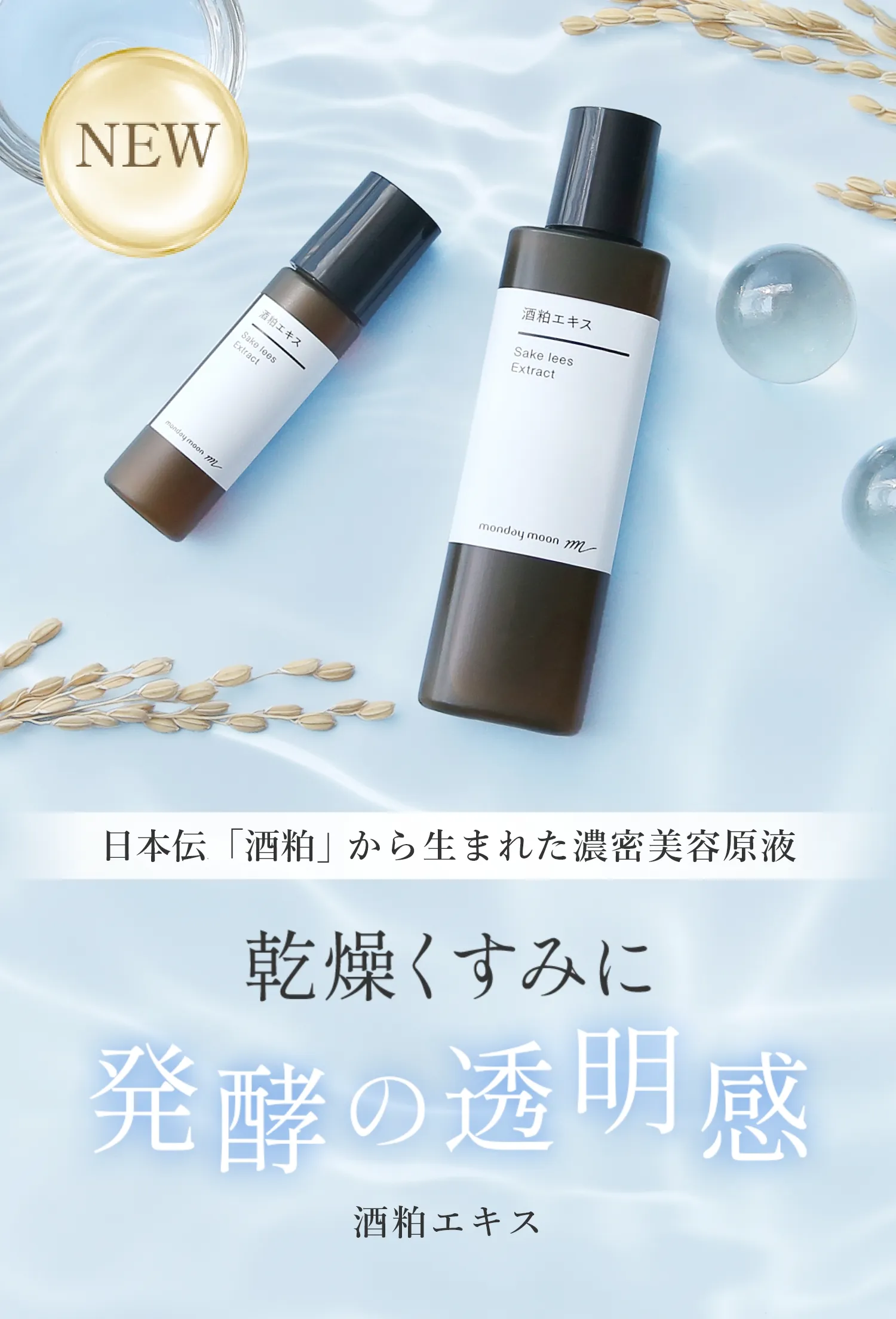 マンデイムーンの酒粕エキスは、佐渡沖の海洋深層水を仕込み水に使用した大吟醸の酒粕を使用。豊富な美容成分を含んでいます。自然の恵みと発酵の技術が生み出す、贅沢な一滴です。