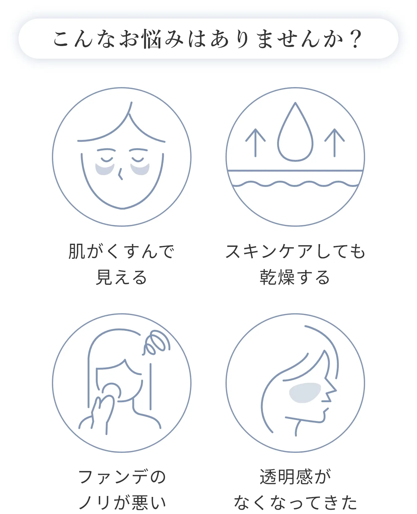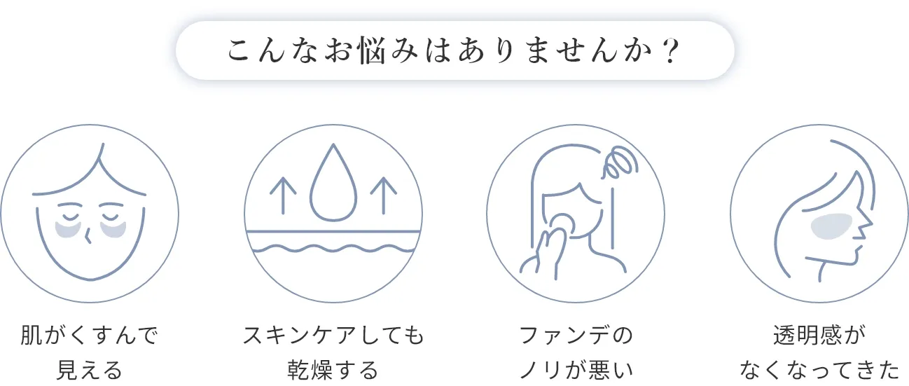 乾燥肌 敏感肌 オイリー肌 くすみ肌 美肌ケア毛穴ケア ヘアケア 地肌ケア エイジングケア 年齢肌 肌荒れ 紫外線対策 保湿ケア 白髪