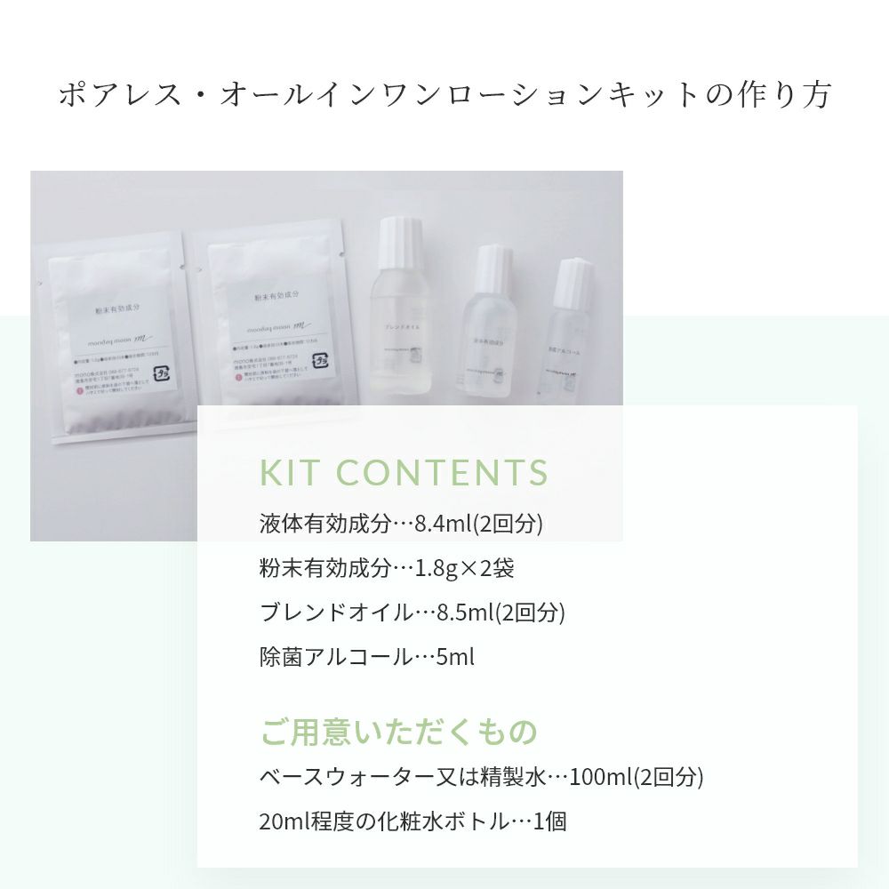 保湿に優れた美容オイルと肌荒れや毛穴、年齢肌に効果的な美容成分をバランスよくブレンドしたローションが作れるキットです。水分と油分の2層仕立てで、肌を理想的なうるおいで満たしてくれます。