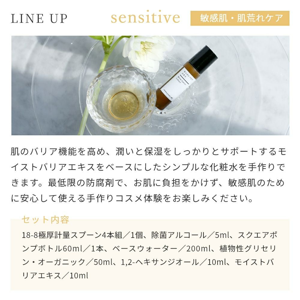 肌のバリア機能を高め、潤いと保湿をしっかりとサポートするモイストバリアエキスをベースにしたシンプルな化粧水を手作りできます。最低限の防腐剤で、お肌に負担をかけず、敏感肌のために安心して使える手作りコスメ体験をお楽しみください。