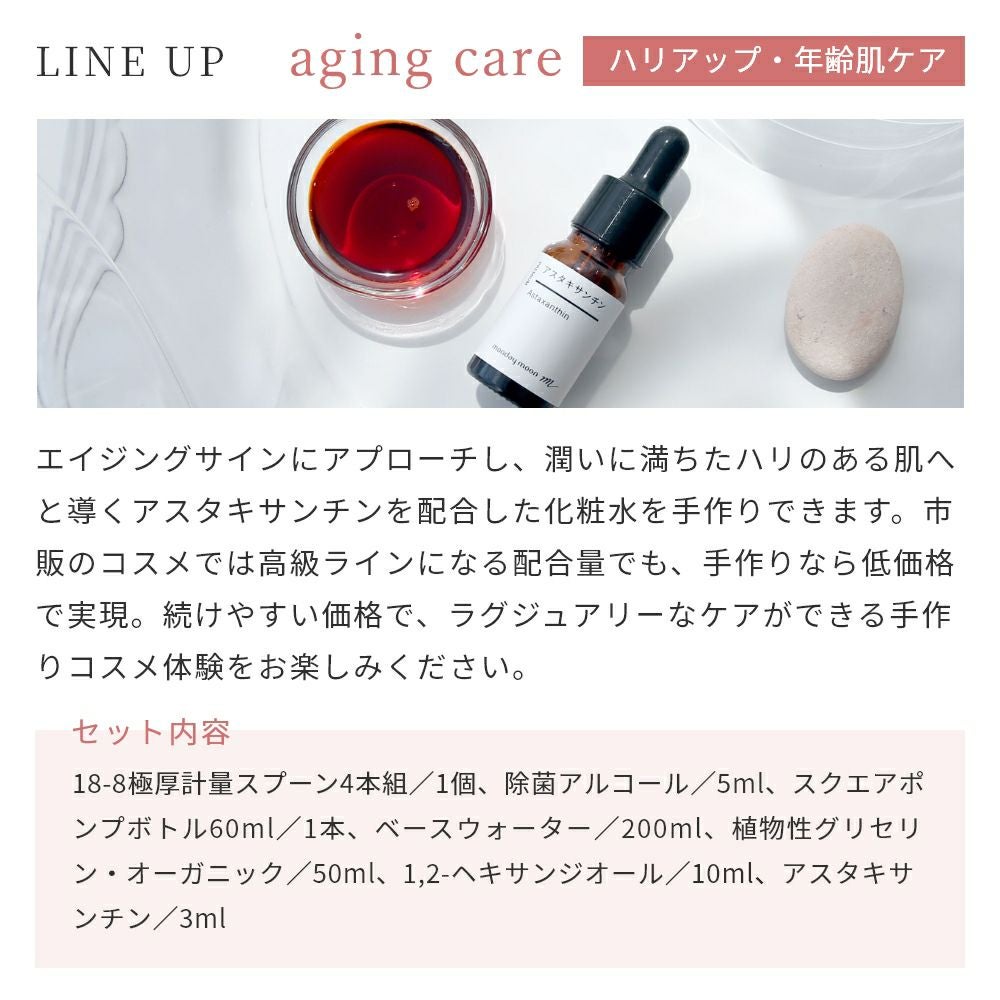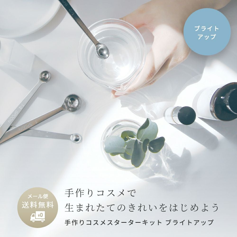 18-8極厚計量スプーン4本組/1個、除菌アルコール/5ml、スクエアポンプボトル60ml/1本、ベースウォーター/200ml、植物性グリセリン・オーガニック/50ml、1,2-ヘキサンジオール/10ml、モイストバリアエキス/10ml