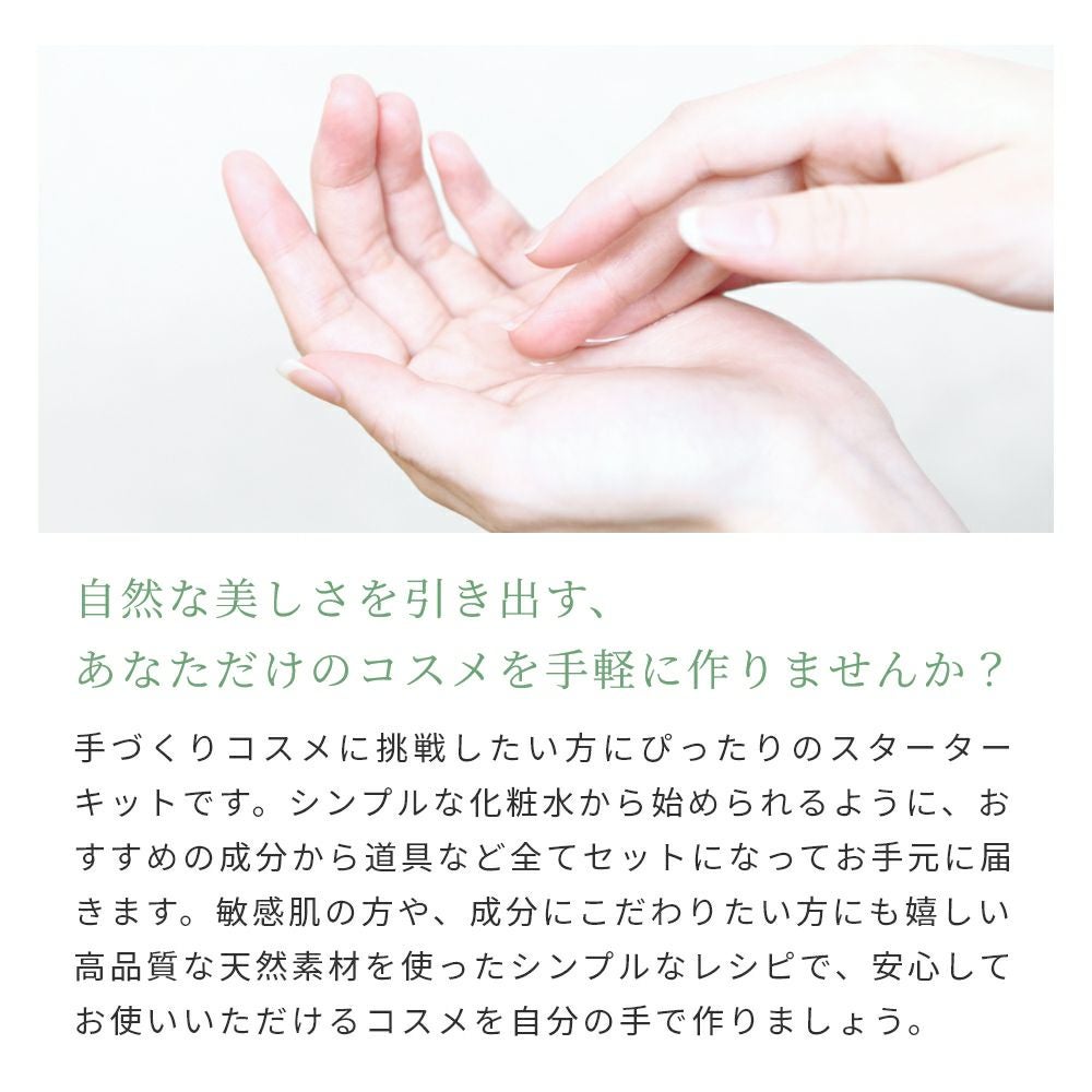手づくりコスメに挑戦したい方にぴったりのスターターキットです。シンプルな化粧水から始められるように、おすすめの成分から道具など全てセットになってお手元に届きます。敏感肌の方や、成分にこだわりたい方にも嬉しい高品質な天然素材を使ったシンプルなレシピで、安心してお使いいただけるコスメを自分の手で作りましょう。