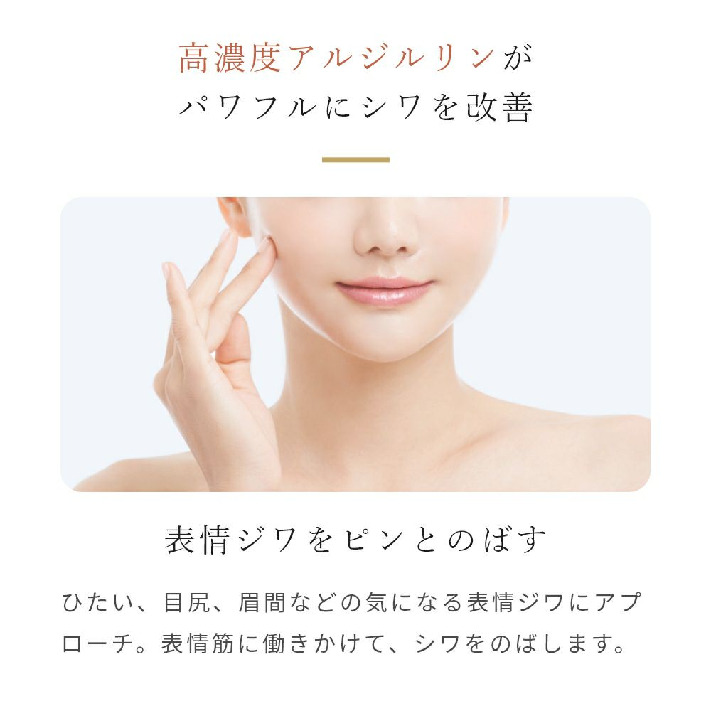 アルジルリンは、ボトックスと同じしくみで表情筋に働きかけて、筋肉の収縮を減少させるアミノ酸です。しかも、ボトックスよりマイルドで表情を失うことはありません。