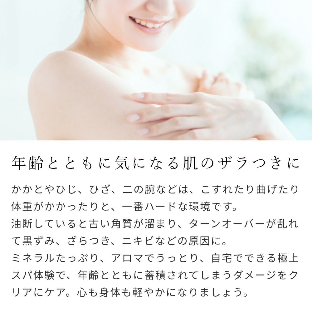かかとやひじ、ひざ、二の腕などは、こすれたり曲げたり体重がかかったりと、一番ハードな環境です。油断していると古い角質が溜まり、ターンオーバーが乱れて黒ずみ、ざらつき、ニキビなどの原因に。ミネラルたっぷり、アロマでうっとり、自宅でできる極上スパ体験で、年齢とともに蓄積されてしまうダメージをクリアにケア。心も身体も軽やかになりましょう。