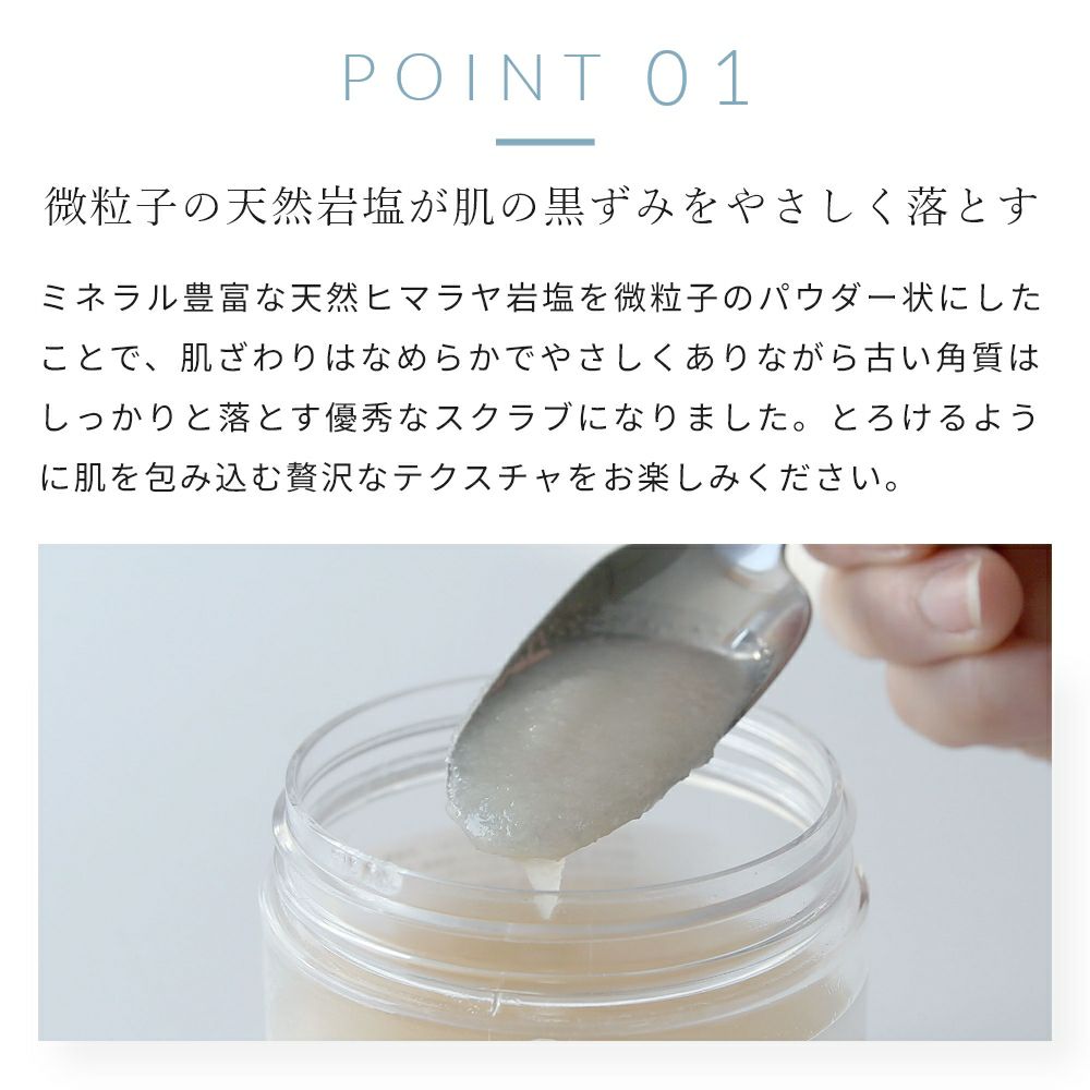 ミネラル豊富な天然ヒマラヤ岩塩を微粒子のパウダー状にしたことで、肌ざわりはなめらかでやさしくありながら古い角質はしっかりと落とす優秀なスクラブになりました。とろけるように肌を包み込む贅沢なテクスチャをお楽しみください。