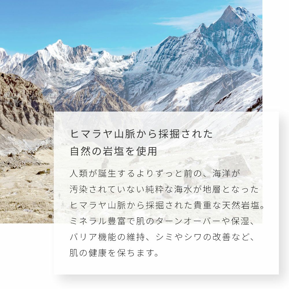 人類が誕生するよりずっと前の、海洋が汚染されていない純粋な海水が地層となったヒマラヤ山脈から採掘された貴重な天然岩塩。ミネラル豊富で肌のターンオーバーや保湿、バリア機能の維持、シミやシワの改善など、肌の健康を保ちます。