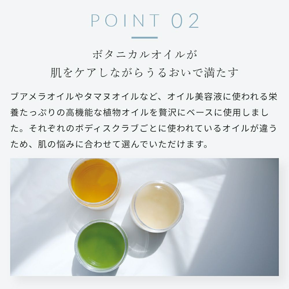 ブアメラオイルやタマヌオイルなど、オイル美容液に使われる栄養たっぷりの高機能な植物オイルを贅沢にベースに使用しました。それぞれのボディスクラブごとに使われているオイルが違うため、肌の悩みに合わせて選んでいただけます。