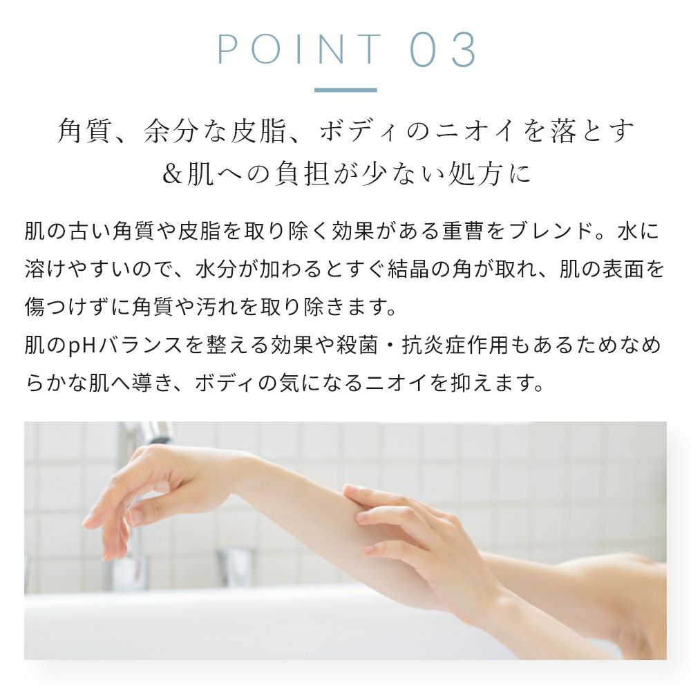 肌の古い角質や皮脂を取り除く効果がある重曹をブレンド。水に溶けやすいので、水分が加わるとすぐ結晶の角が取れ、肌の表面を傷つけずに角質や汚れを取り除きます。肌のpHバランスを整える効果や殺菌・抗炎症作用もあるためなめらかな肌へ導き、ボディの気になるニオイを抑えます。