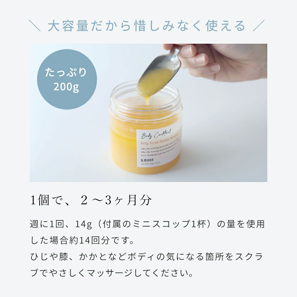 週に1回、14g(付属のミニスコップ1杯)の量を使用した場合約14回分です。ひじや膝、かかとなどボディの気になる箇所をスクラブでやさしくマッサージしてください。