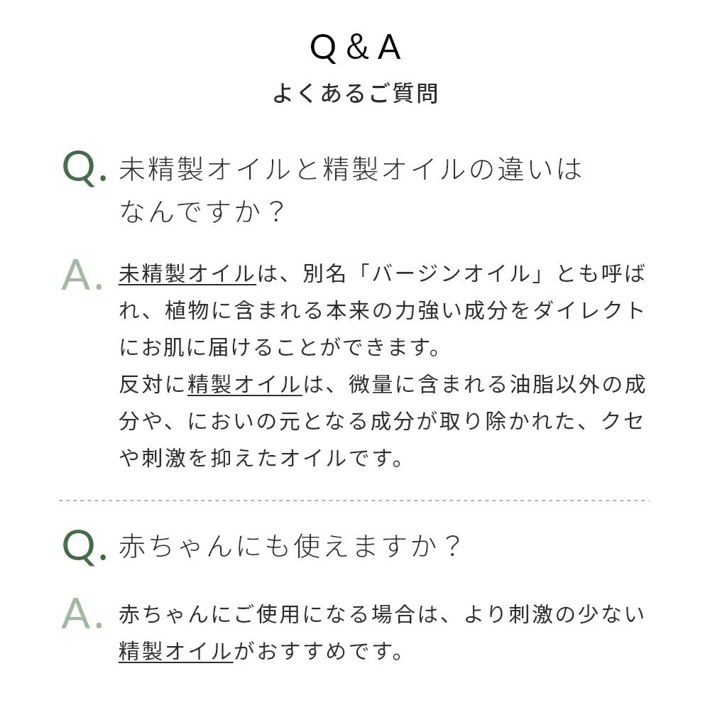 未精製オイルは、別名「バージンオイル」とも呼ばれ、植物に含まれる本来の力強い成分をダイレクトにお肌に届けることができます。 反対に精製オイルは、微量に含まれる油脂以外の成分や、においの元となる成分が取り除かれた、クセや刺激を抑えたオイルです。