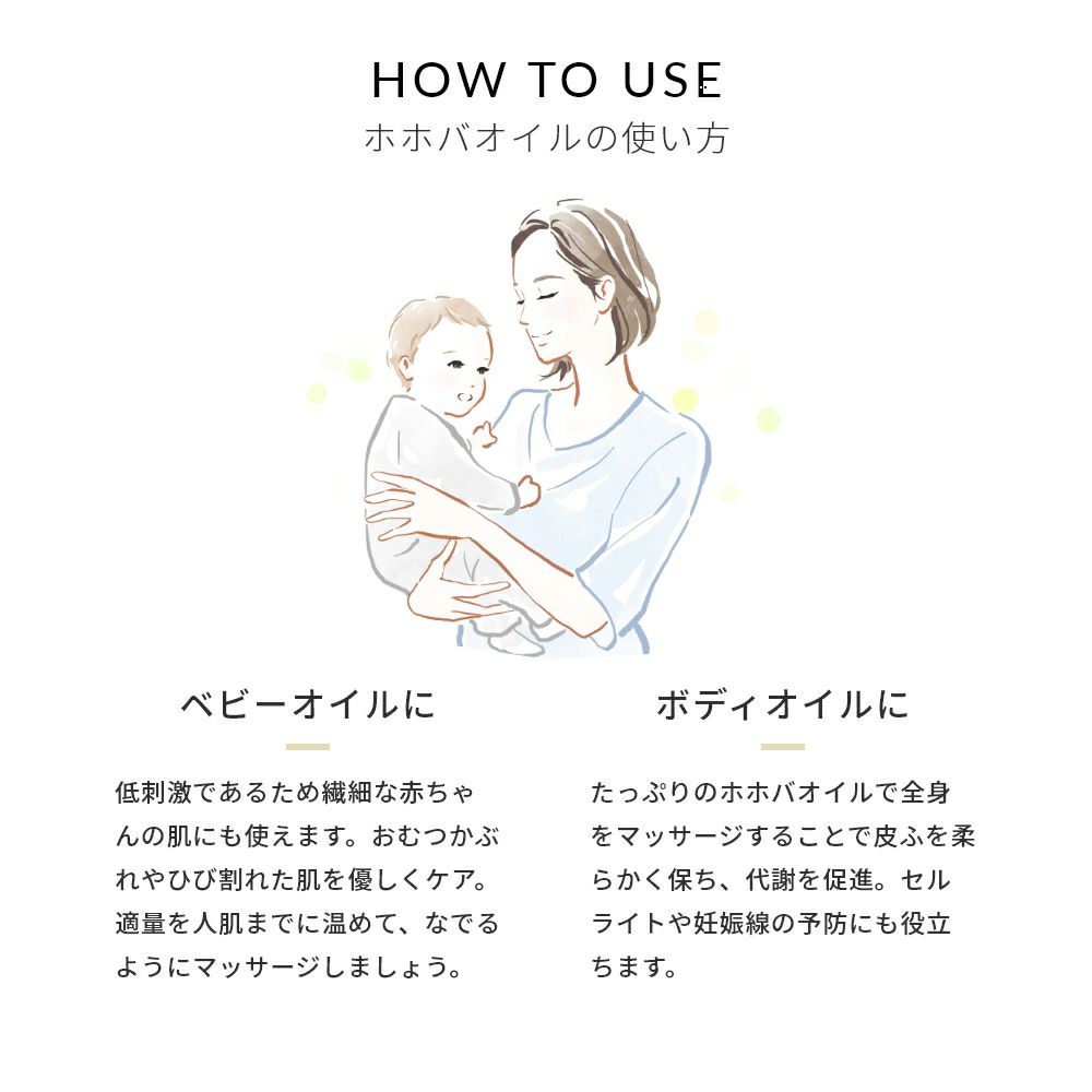 ホホバオイルは低刺激なオーガニックオイル。 肌質を問わず、植物由来の美容成分が 肌に元気をもらたします。