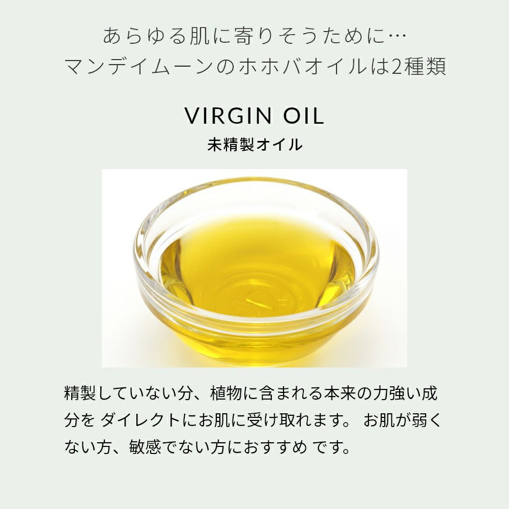 ホホバオイルの生まれながらの美容成分を豊富なままに享受できるのが「未精製オイル」の強み。精製していない分、植物本来の栄養をダイレクトにお肌に取りこめます。お肌の弱い方やベビーには…より刺激の少ない「精製オイル」をお使いください。