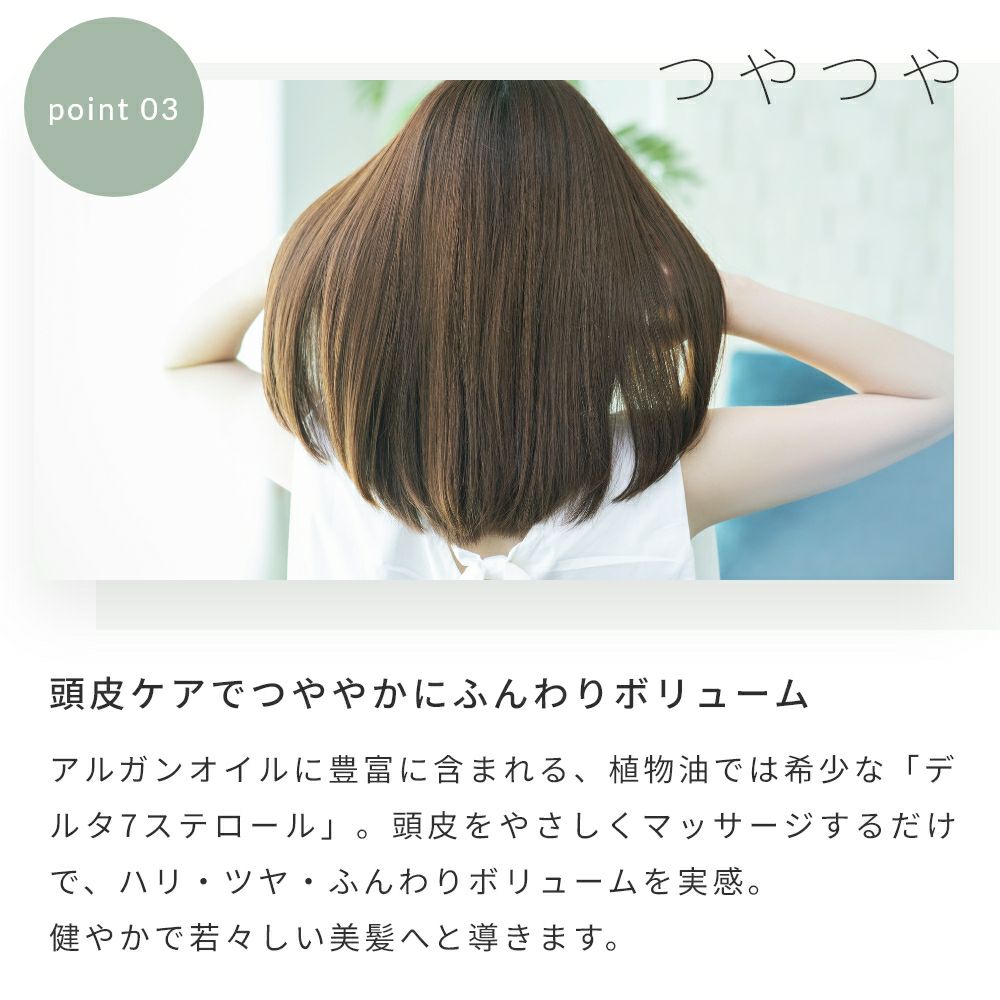 アルガンオイルに豊富に含まれる、植物油では希少な「デルタ7ステロール」。頭皮をやさしくマッサージするだけで、ハリ・ツヤ・ふんわりボリュームを実感。健やかで若々しい美髪へと導きます。
