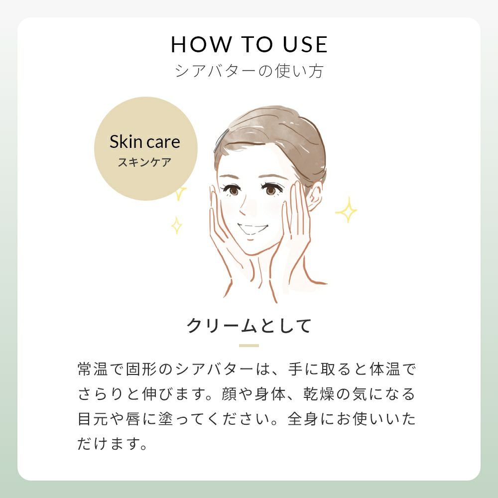 常温で固形のシアバターは、手に取ると体温でさらりと伸びます。顔や身体、乾燥の気になる目元や唇に塗ってください。全身にお使いいただけます。