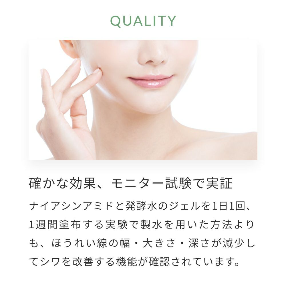 ナイアシンアミドと発酵水のジェルを1日1回、1週間塗布する実験で製水を用いた方法よりも、ほうれい線の幅・大きさ・深さが減少してシワを改善する機能が確認されています。
