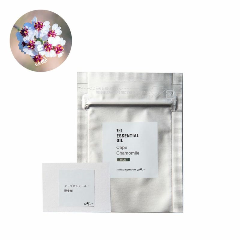 マンデイムーンのケープカモミール・エッセンシャルオイルは、南アフリカの海岸の山の斜面に沿って自生するエリオセファルス・プントゥラトゥス(Eriocepalus Punctulatus )の小さなつぼみと美しい白い花から抽出したものです。 ケープカモミールはエリオセファルス・プントゥラトゥスまたはカモミールケープとも呼ばれています。 カマズレンを多く含むため透明な青色をしています。 ●香りについて 甘くフルーティーで、花のような、土のような、ハーブの香りです。ケープカモミールはカモミールの中でも最も魅力的な香りを持ち、高級香水にも使用されています。 ●ご使用シーン 肌を整え健やかに保つカマズレンが豊富に含まれているため、スキンケアアイテムの香りづけにおすすめです。また、日中に使用すると心を穏やかに落ち着け、夜は体と心をリラックスさせ、深く安らかな眠りに導く効果が期待されます。