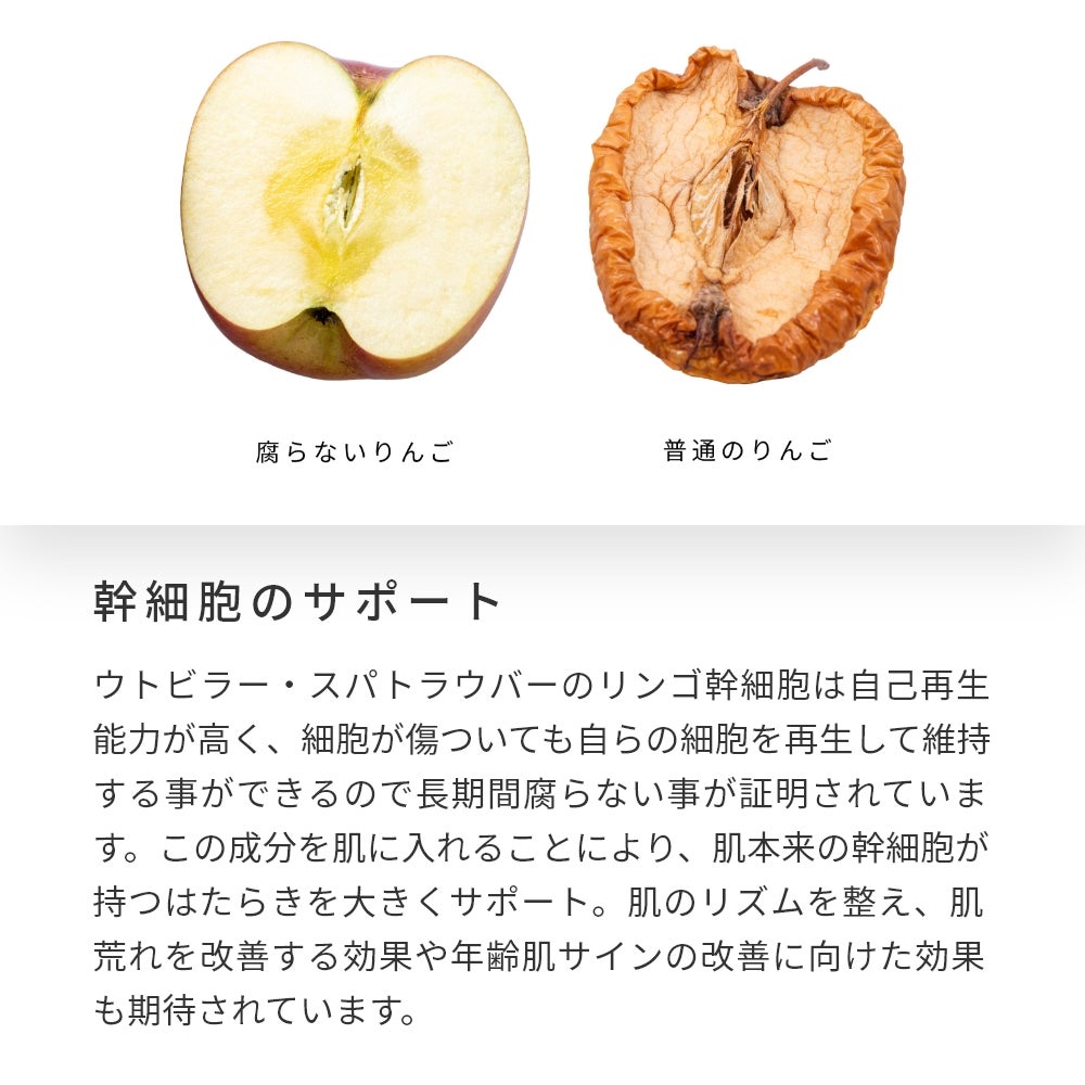 このリンゴは収穫後4ヶ月経過しても腐らない“奇跡のリンゴ”。そこに含まれる幹細胞から抽出した成分はヒト皮膚幹細胞のはたらきを高め、肌のリズムを整える効果が期待されています。