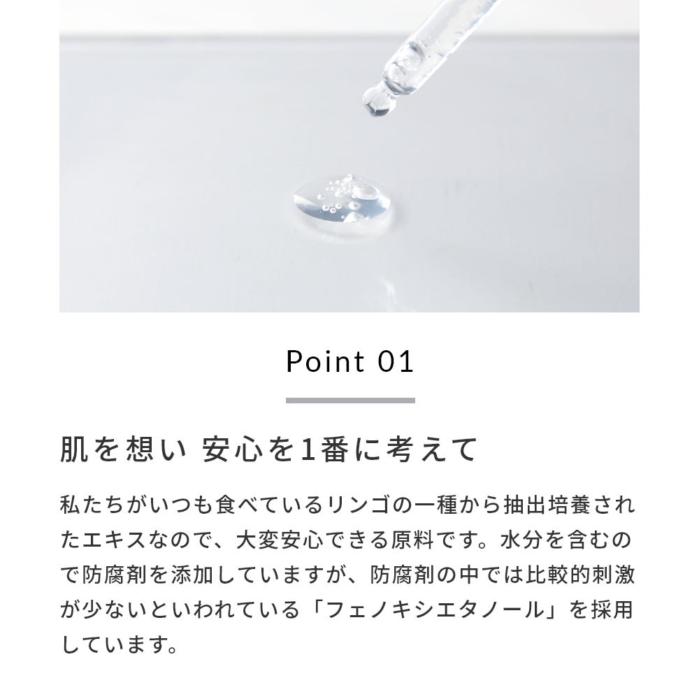 安心を1番に考えて私たちがいつも食べているリンゴの一種から抽出培養されたエキスなので、大変安心できる原料です。水分を含むので防腐剤を添加していますが、防腐剤の中では比較的刺激が少ないといわれている「フェノキシエタノール」を採用しています。