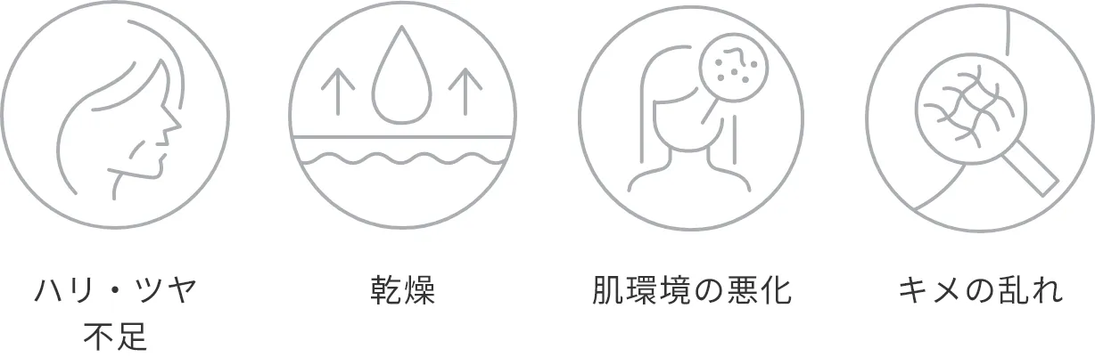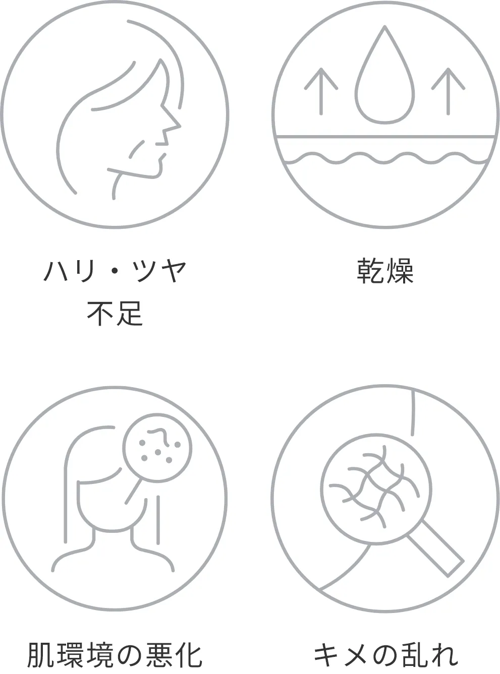 玄米こうじ発酵エキスは、アミノ酸やペプチドを含む900種以上の発酵代謝産物を含有。乾燥やハリ不足など、年齢とともに感じやすい肌変化にうるおいで応え、キメ の整った、なめらかで明るい印象の肌へ 導きます。