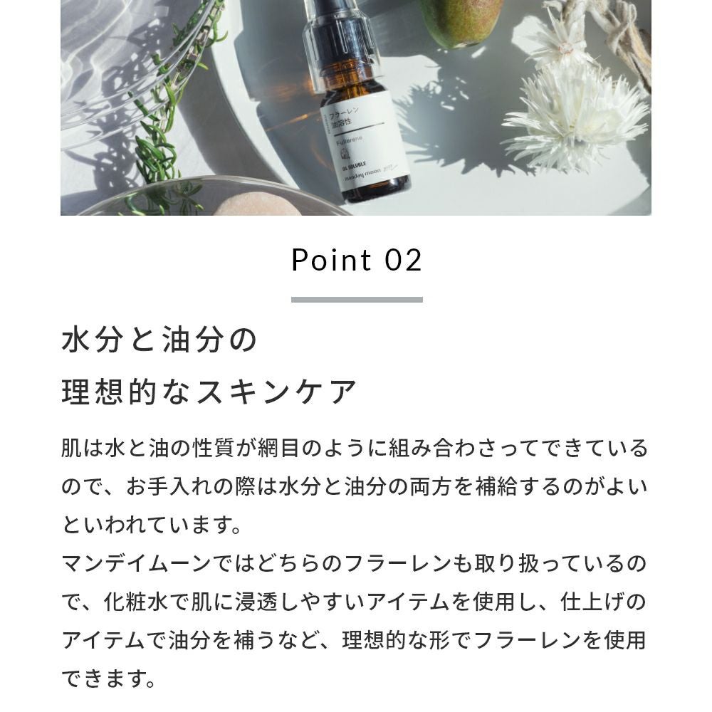 マンデイムーンではどちらのフラーレンも取り扱っているので、化粧水で肌に浸透しやすいアイテムを使用し、仕上げのアイテムで油分を補うなど、理想的な形でフラーレンを使用できます。