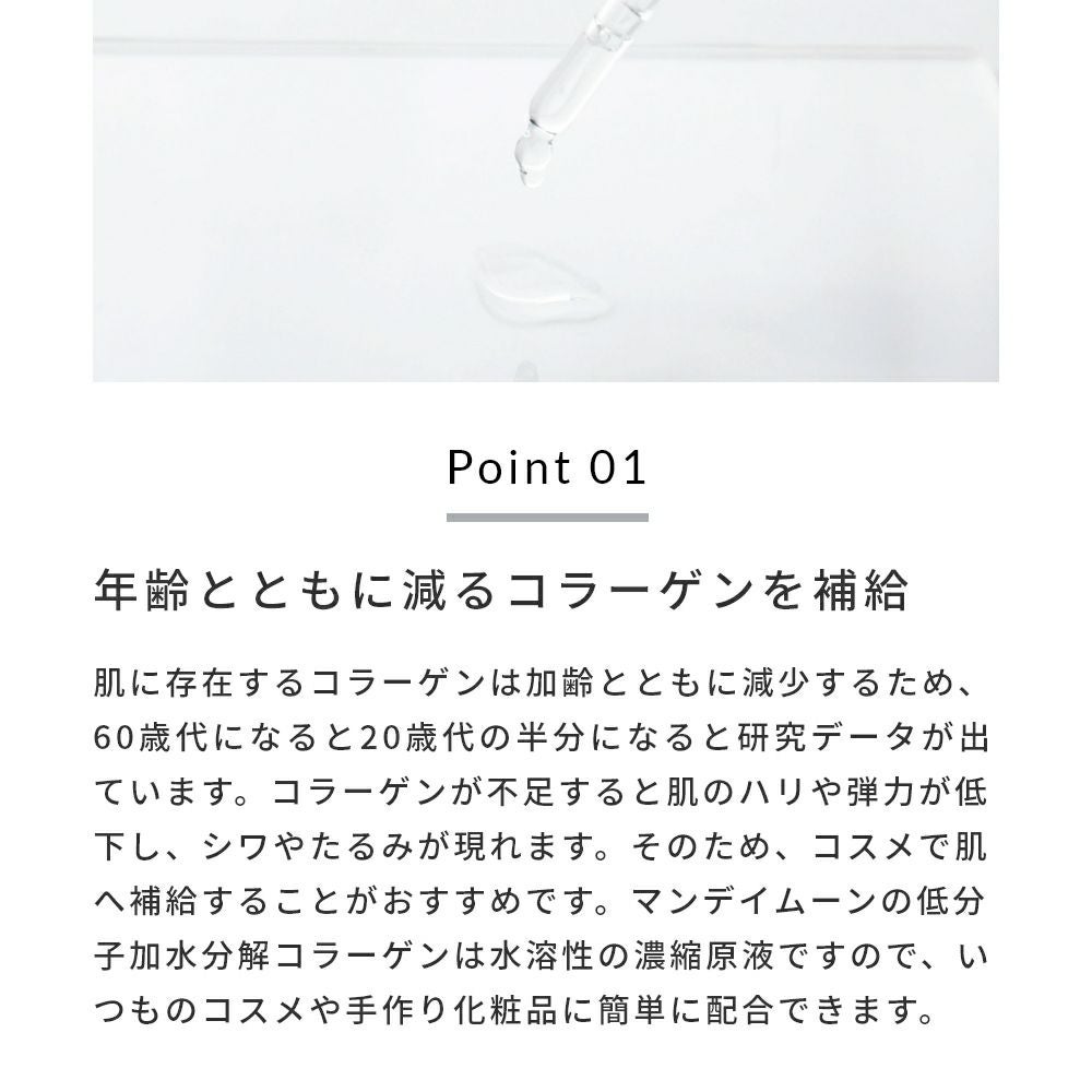 他の画像を見る 肌への高い浸透力。ハリ、キメの整えに効果的。化粧水や美容液、クリームなど手作りコスメ原料に。 低分子加水分解コラーゲン/10ml メール便OK クール便OK 価格 ¥ 1,980 税込 詳細を見る お気に入りに登録する