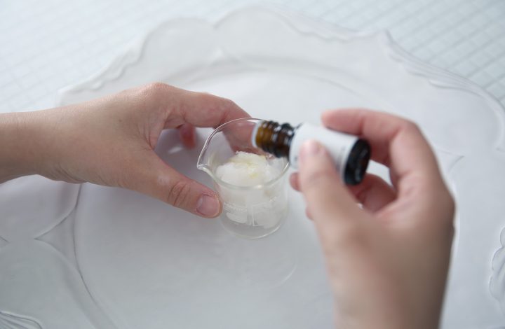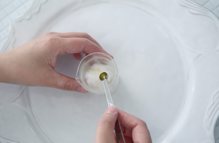 クリームソープベースにオイル0.5ml 1/2spn×1とエッセンシャルオイル6滴を加えます。