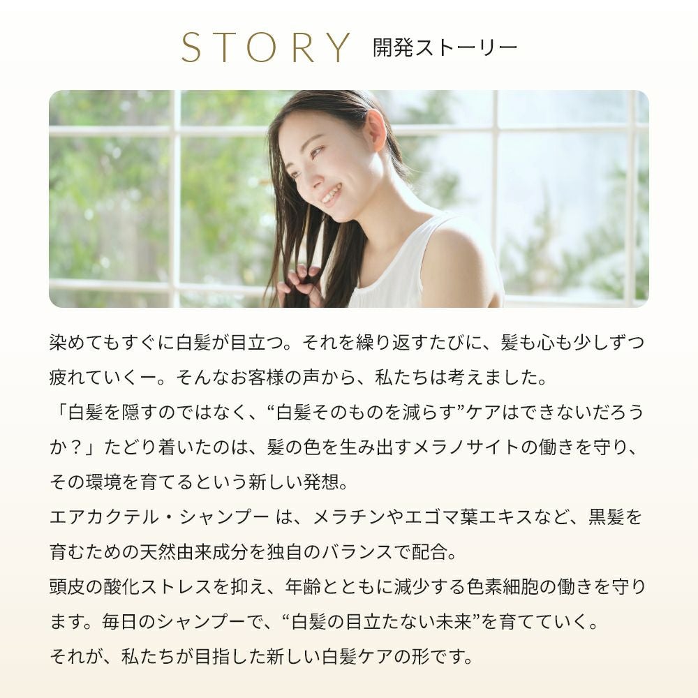 他の画像を見る 白髪専用高級ケア成分“メラチン”配合で黒く美しい髪へ エアカクテル シャンプー/300ml NEW 15%OFF クール便OK 当店通常価格 ¥ 4,290 (税込)のところ 価格 ¥ 3,646 税込 販売期間 2026/03/04 11:00 〜 2026/03/06 11:00 カートに入れる お気に入りに登録する