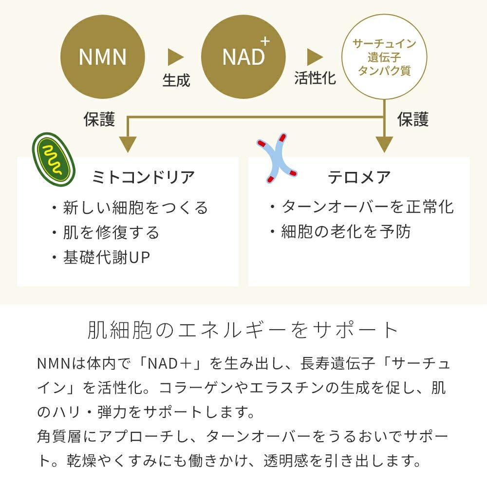他の画像を見る ハリ、透明感高める。年齢に応じた肌悩み対策、NMN高濃度美容液 NMN(ニコチンアミドモノヌクレオチド)/30ml 15%OFF クール便OK 当店通常価格 ¥ 4,455 (税込)のところ 価格 ¥ 3,786 税込 販売期間 2026/03/04 11:00 〜 2026/03/06 11:00 カートに入れる お気に入りに登録する
